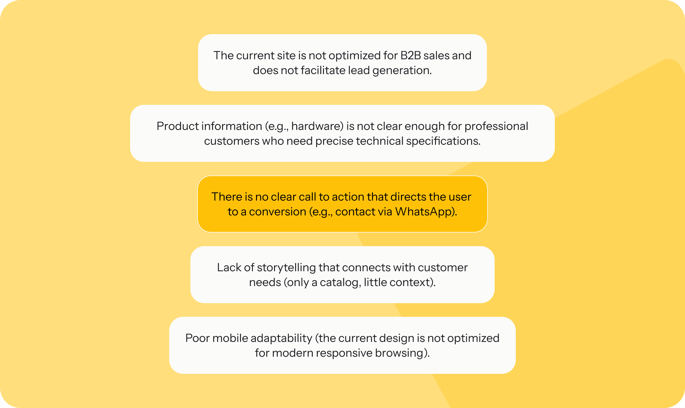 Calls to Actions (CTAs) for direct contact via WhatsApp were prioritized. The contact button is visible on all pages and is strategically placed to facilitate the first step of conversion. |